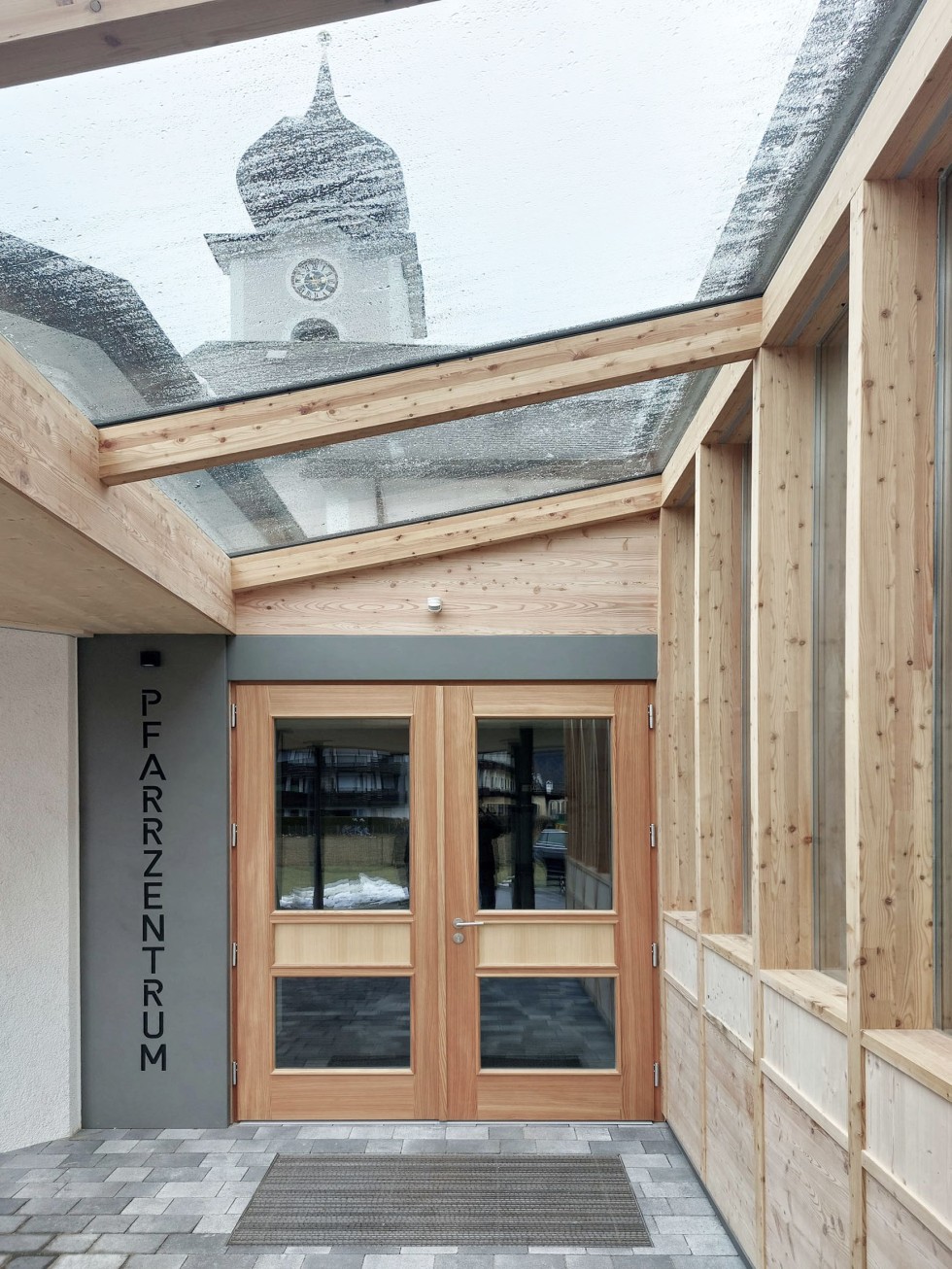 AufgabeNeue Erschließung für die Wohnbereiche im Obergeschoss und Überdachung des Zugangbereiches zwischen dem barocken Pfarrhof und des Pfarrzentrums.Die Architektur soll im Bereich der Eingangszone zu einer "Willkommensgeste" einladen.